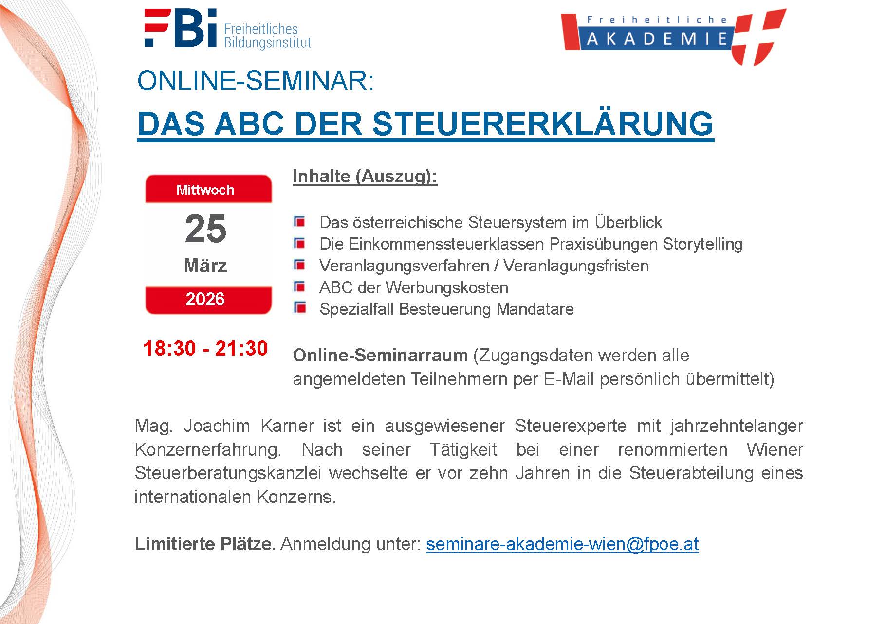 Das Freiheitliche Bildungsinstitut lädt zum Online-Seminar „Das ABC der Steuererklärung“ ein, das einen strukturierten Überblick über das österreichische Steuersystem sowie zentrale Aspekte der Einkommensteuer, Veranlagungsverfahren und Werbungskosten vermittelt und dabei sowohl theoretische Grundlagen als auch praxisnahe Anwendungsbeispiele behandelt. Der Vortrag wird von Mag. Joachim Karner, einem erfahrenen Steuerexperten mit langjähriger Tätigkeit in der Steuerberatung und Konzernpraxis, durchgeführt und richtet sich an alle Interessierten, die ihre Kenntnisse im Bereich der Steuererklärung vertiefen möchten.